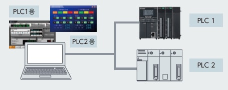 PLC 멀티 토크 기능으로 2종류의 PLC(다른 제조사도 가능)와 각각 16대까지 접속할 수 있습니다. 각 PLC의 상태를 Soft-VT 1대로 일괄 감시할 수 있습니다.