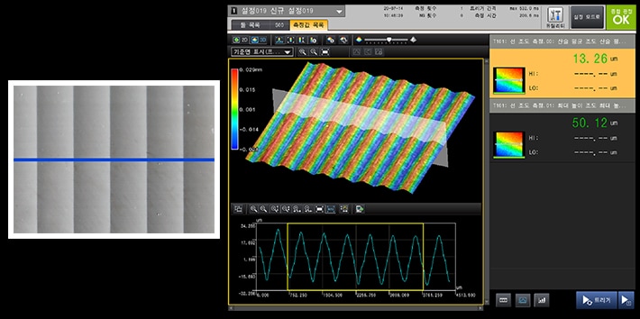 지정된 범위의 선 거칠기(Ra·Rz)를 측정할 수 있습니다. 최단 0.13초의 정지 시간으로 성형품 표면 거칠기나 연삭된 금속 표면 등의 거칠기 수치를 관리할 수 있습니다.