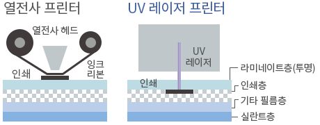 필름 표면에 잉크를 전사하는 기존의 열전사 프린터 방식과 달리, UV 레이저 광을 조사함으로써 필름의 인쇄층을 발색하여 인쇄하는 방식입니다.