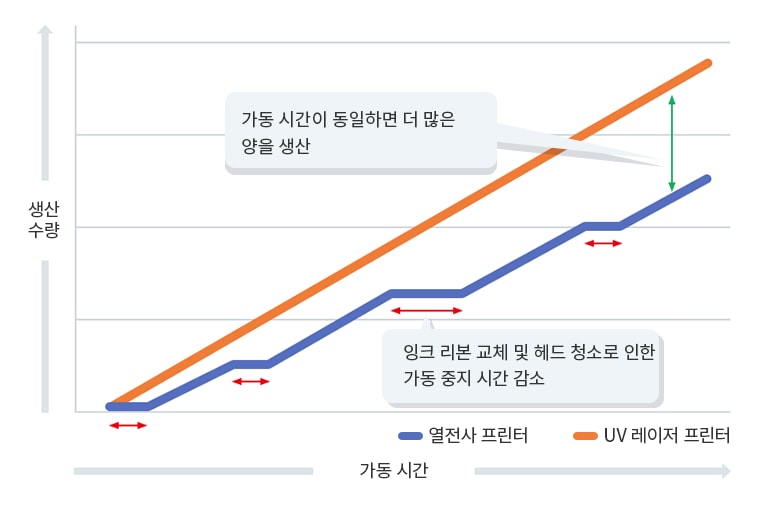 빛으로 인쇄하는 UV 레이저 프린터는 기존의 감열식 프린터에서 발생하던 다운 타임(잉크 리본 교체 및 헤드 청소 시간)이 발생하지 않습니다.또한, 다운 타임이 없는 만큼 더 많은 제품을 생산할 수 있으므로 라인 가동률을 높일 수 있습니다.
