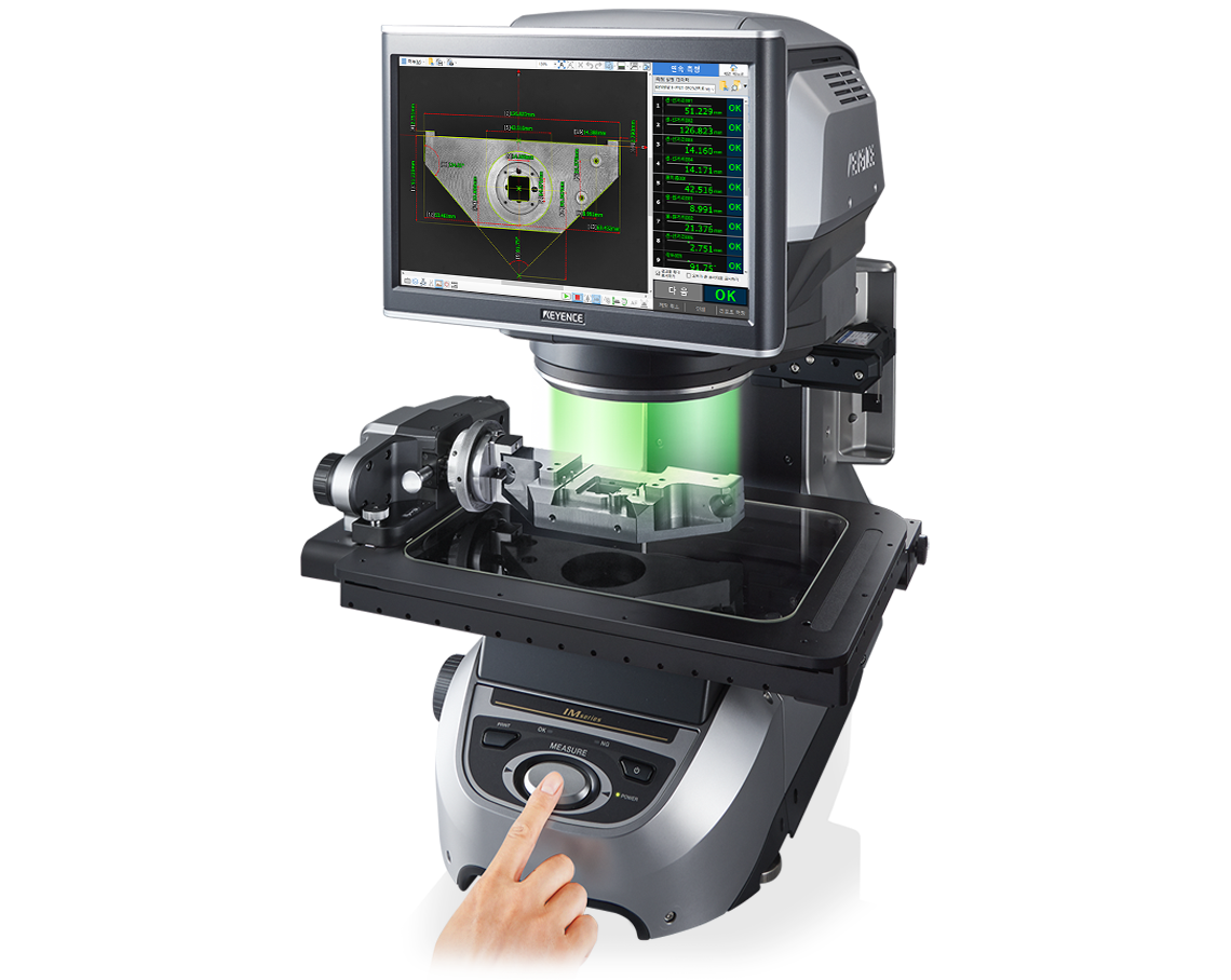 대상 물체를 고해상도로 포착할 수 있는 이미지 치수 측정 시스템 IM-8000 시리즈는 간단한 조작은 그대로 유지하면서 검출 성능을 기존 대비 3배로 향상시켰습니다. 2000만 화소 CMOS와 안정적으로 에지를 검출할 수 있는 새로운 알고리즘을 채택하여 불과 몇 초만에 최대 300포인트의 고정도 측정이 완료됩니다. 또한 새로 개발된 「회전 유닛」을 활용할 경우, 다양한 사이즈∙형상의 대상 물체를 수평을 유지한 채로 자동으로 회전시켜 360° 다면을 안정적으로 일괄 측정할 수 있습니다. 측정 버튼을 누르기만 하면 OK인 간단한 조작이므로 작업자에 따른 측정값 편차가 발생하지 않아 측정 공정 수가 압도적으로 줄어듭니다. 신속·정확·간단한 측정으로 측정 업무의 과제를 해결합니다.