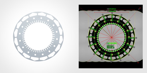 대상 물체를 고해상도로 포착할 수 있는 이미지 치수 측정 시스템 IM-8000 시리즈는 간단한 조작은 그대로 유지하면서 검출 성능을 기존 대비 3배로 향상시켰습니다. 2000만 화소 CMOS와 안정적으로 에지를 검출할 수 있는 새로운 알고리즘을 채택하여 불과 몇 초만에 최대 300포인트의 고정도 측정이 완료됩니다. 또한 새로 개발된 「회전 유닛」을 활용할 경우, 다양한 사이즈∙형상의 대상 물체를 수평을 유지한 채로 자동으로 회전시켜 360° 다면을 안정적으로 일괄 측정할 수 있습니다. 측정 버튼을 누르기만 하면 OK인 간단한 조작이므로 작업자에 따른 측정값 편차가 발생하지 않아 측정 공정 수가 압도적으로 줄어듭니다. 신속·정확·간단한 측정으로 측정 업무의 과제를 해결합니다.