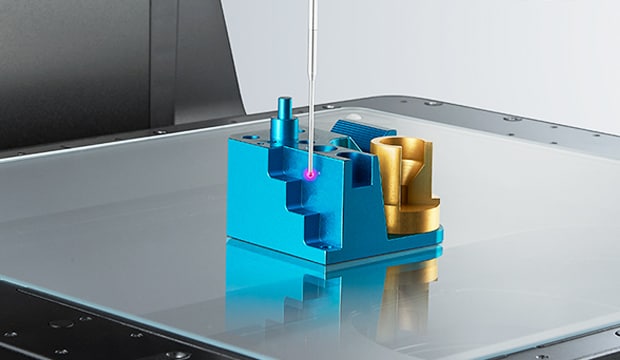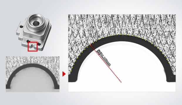 가로·세로·대각선으로 자유롭게 움직이는 저측정압 터치 프로브가 원하는 포인트를 저압으로 접촉해 측정합니다. 복잡한 입체 형상도 정확하게 측정할 수 있습니다.