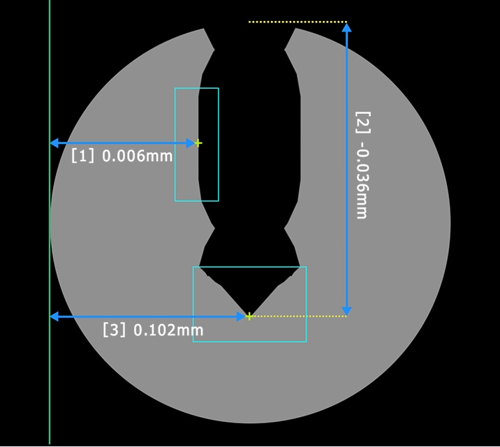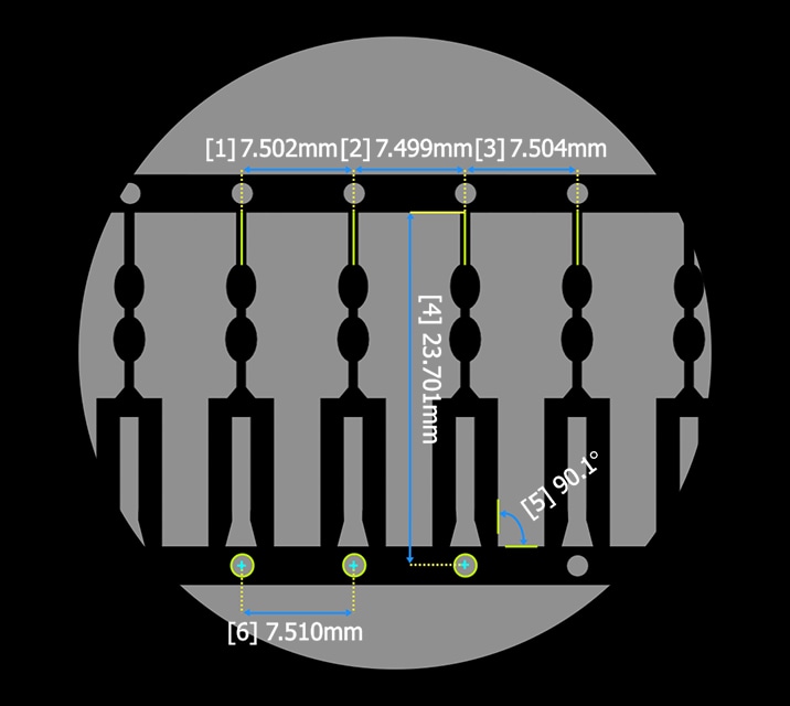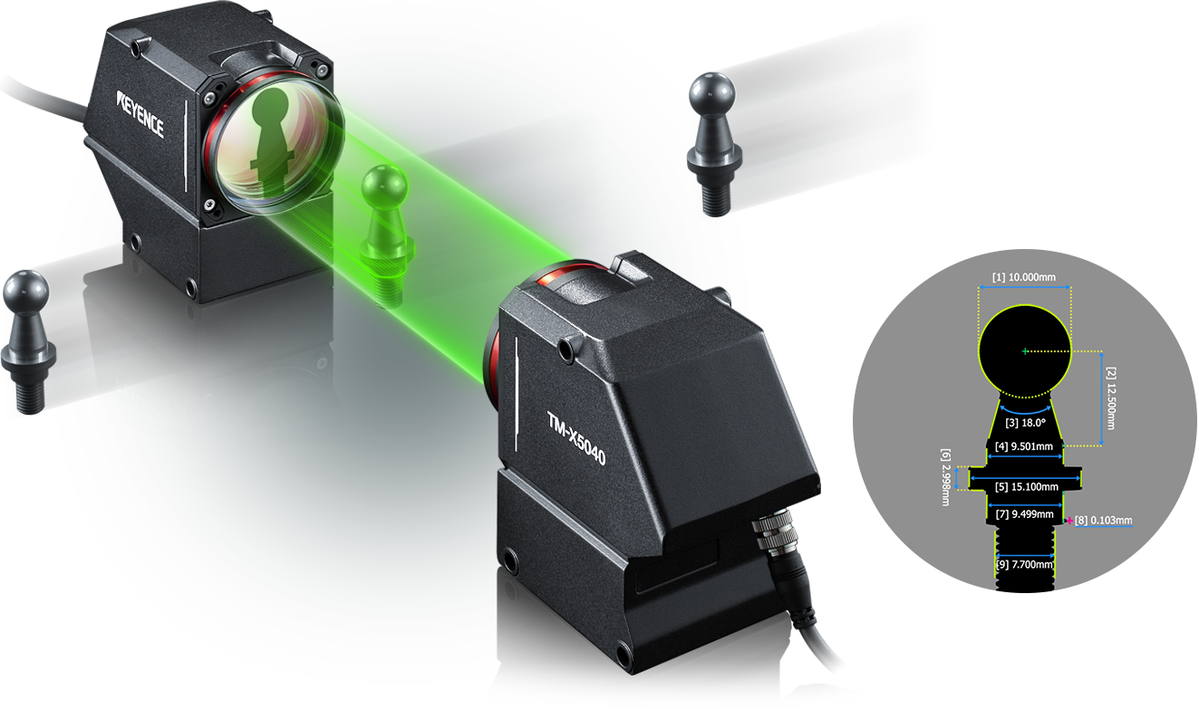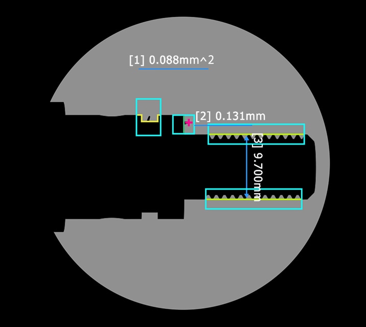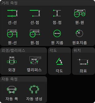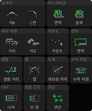 조합에 따라 100가지가 넘는 측정 툴을 준비. 심플한 치수 측정은 물론 기하 공차 측정, 품종 판별 시 편리한 마스터 비교, 외관 검사 시 편리한 이물 거리 측정 등 인라인 검사에 필요한 다양한 측정 내용을 실현합니다.