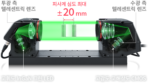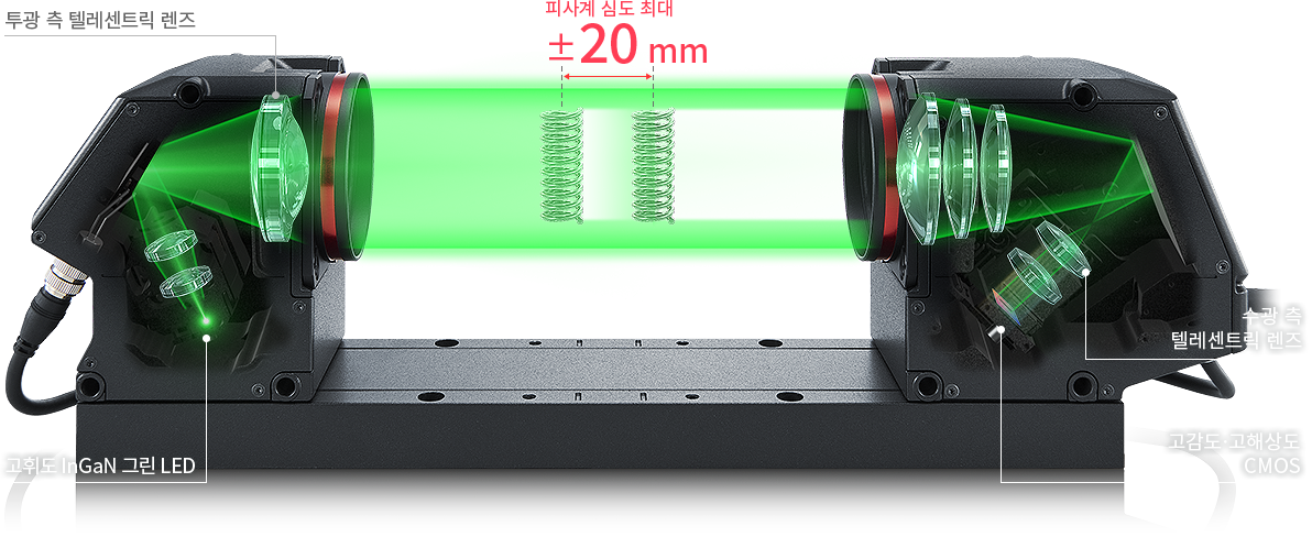 투광 측·수광 측 모두 텔레센트릭 광학계를 채택한 더블 텔레센트릭 광학계로 에지를 선명하게 촬상하므로 대상 물체의 위치가 어긋나도 정도에 변화가 없습니다. 피사계 심도 최대 ±20mm의 사양을 보증합니다.