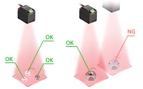 기준이 되는 배경까지의 거리와 수광량을 기억해 두었다가 기억한 상태와 검출 에어리어로 들어온 대상 물체의 거리 및 수광량이 다르면 검출합니다. 배경이 있으면 형상이 복잡하거나 대상 물체의 색 또는 표면 상태가 변하더라도 확실하게 검출할 수 있으며 단차가 적은 얇은 대상 물체도 안정적으로 검출할 수 있습니다.