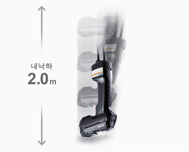 내충격성이 뛰어난 러버 프로텍터가 탑재되어 있어 2.0 m에서 낙하해도 파손되지 않는 초고강도 본체를 실현했습니다. 긴 수명·높은 내구성으로 사용 빈도가 높은 현장에서도 안심하고 사용할 수 있습니다.