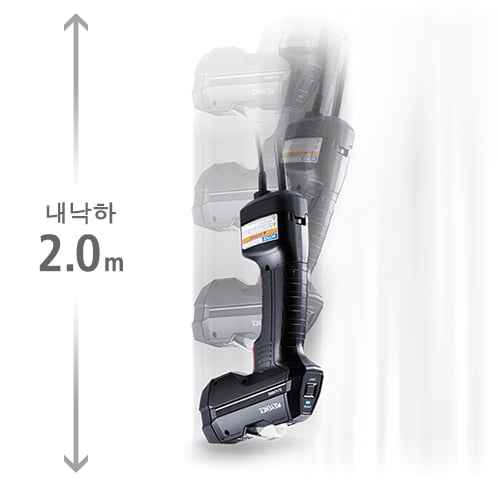 내충격성이 뛰어난 러버 프로텍터가 탑재되어 있어 2.0 m에서 낙하해도 파손되지 않는 초고강도 본체를 실현했습니다. 긴 수명·높은 내구성으로 사용 빈도가 높은 현장에서도 안심하고 사용할 수 있습니다.