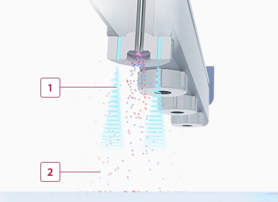 Supersonic 에어가 전극침과 동일한 축에서 감싸듯이 분사되기 때문에 외부 에어에 의한 오염 물질이 부착되지 않습니다.