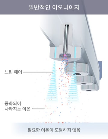 전극침이 오염되어도 확실하게 제전합니다. Supersonic 에어가 전극침과 동일한 축에서 감싸듯이 분사되기 때문에 외부 에어에 의한 오염 물질이 부착되지 않습니다.