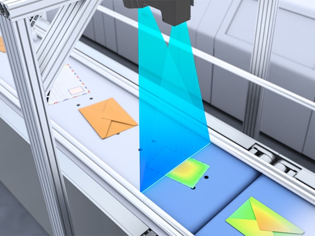 고속으로 우편물을 자동 분류하는 물류 시스템에서는, 각 우편물의 크기(가로, 세로)와 두께를 실시간으로 정확히 측정하는 것이 핵심입니다.