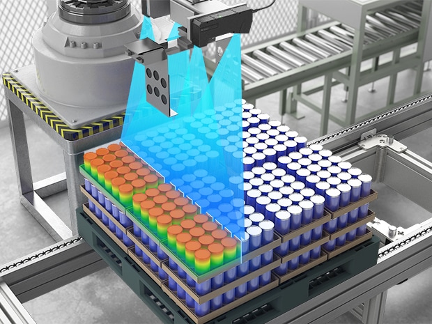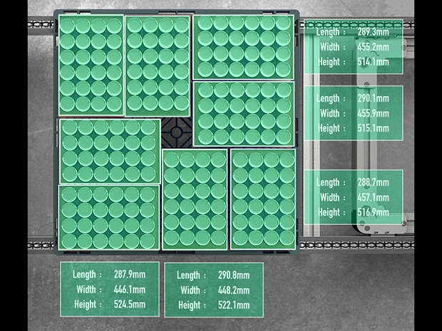 LJ-X 시리즈를 로봇에 장착하면, 피킹 직전에 팔레트 상단의 3D 형상을 실시간으로 스캔합니다. 이를 통해, 각 상자의 정확한 3차원 위치 좌표(X, Y, Z)와 기울기 정보를 취득할 수 있습니다. 이 데이터를 기반으로 로봇은 최적의 접근 경로와 파지점을 스스로 계산하여, 어떠한 적재 상태에서도 실패 없이 안정적으로 상자를 피킹하는 지능형 디팔레타이징 시스템을 구축할 수 있습니다.