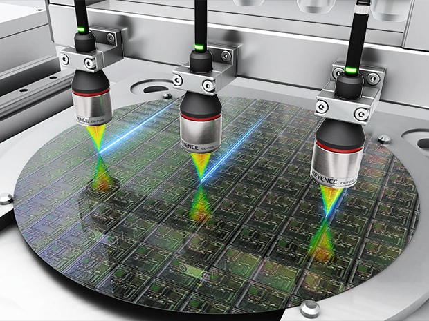 레이저 동축 변위 센서 CL 시리즈를 사용하면 웨이퍼까지의 거리를 비접촉으로 측정할 수 있으므로, 대상물 손상 우려 없이 Z축을 정밀하게 조정할 수 있습니다. 또한 소형 헤드이므로 장치 내 한정된 공간에도 설치할 수 있습니다.