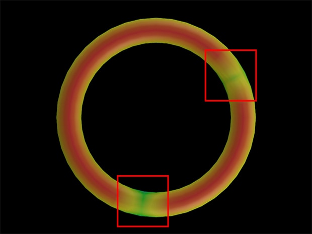 카메라를 이용한 기존 방식의 O링 검사는 색상 차이가 뚜렷하게 표시되지 않기 때문에 검출 안정성이 떨어졌습니다. 하지 만 LJ-S8000은 3D 데이터를 활용하여 색상이 아닌 높이 차이를 바탕으로 판정할 수 있으므로 불량품의 유출을 사전에 방 지할 수 있습니다.