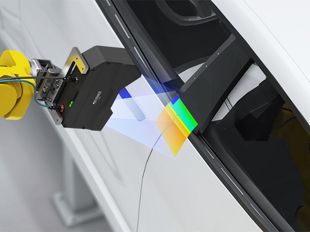 기존에는 단면 형상 프로파일로 품질 검사를 했지만, LJ-S8000은 내장된 스캔 모터를 통해 640×640 mm의 넓은 면적 을 한 번에 검사할 수 있습니다. 센서 헤드를 로봇에 탑재하여 다양한 부위의 치수를 측정할 수 있습니다.