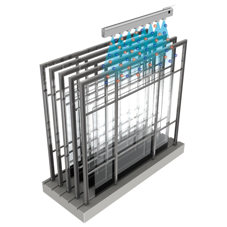 팔레트에 수직으로 쌓아 이송하는 유리판은 이송 중 발생하는 마찰로 인해 쉽게 대전됩니다. 이렇게 대전된 상태로 후공정을 대기하는 동안 공기 중의 이물질이 부착되어 품질 불량을 유발하고, 이를 해결하기 위한 재검사·제거 공정이 추가되어 생산성을 저해했습니다.