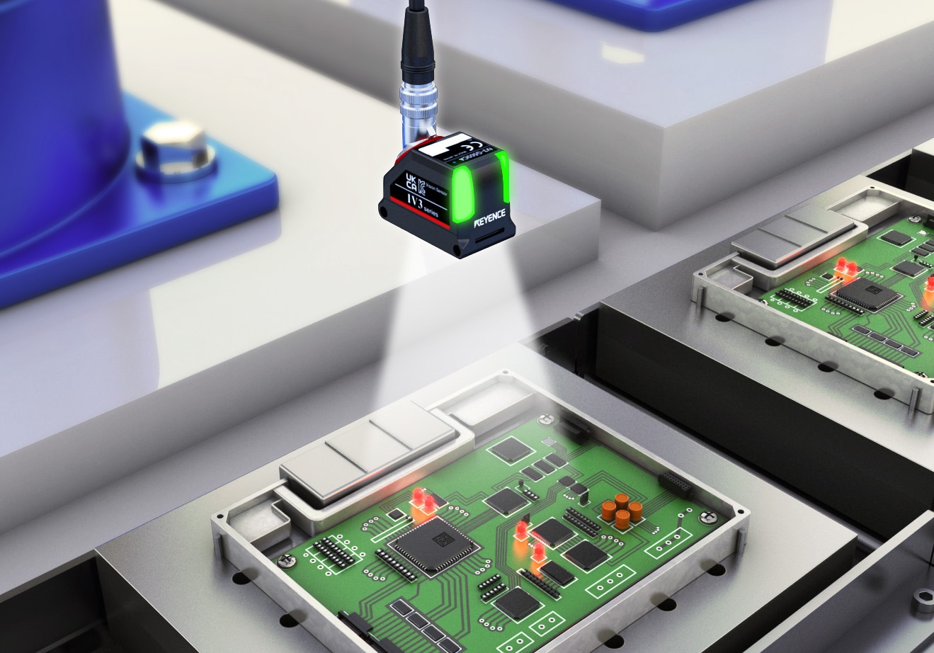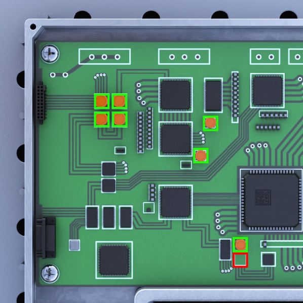 프린트 기판 위에 실장된 여러 부품의 유무를 검사하여 실수를 방지합니다. 기존 방식으로는 검사 지점마다 센서를 여러 대 설치해야 하는 번거로움이 있었고, 기판의 위치가 틀어지면 안정적인 검사가 어려웠습니다.