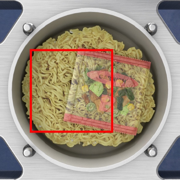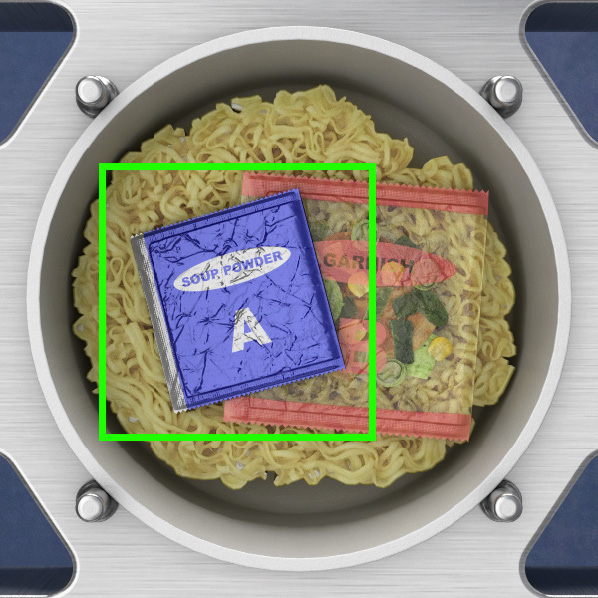 포장 전 컵라면에 2종류의 수프 봉지가 올바르게 들어갔는지, 이품종이 혼입되지 않았는지 검출합니다. 하지만 봉지의 위치가 틀어지거나 품종이 자주 바뀌는 경우, 기존 방식으로는 안정적인 검사와 신속한 대응이 어려웠습니다.