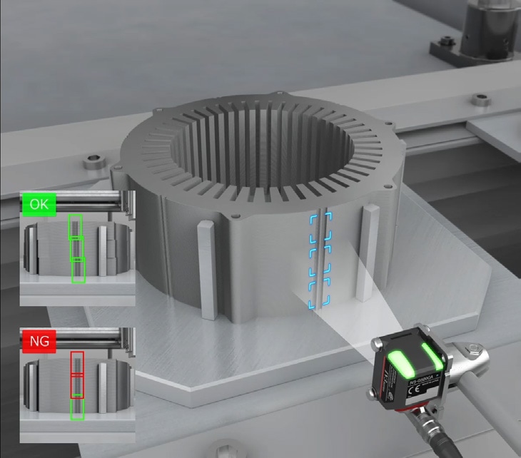 AI 탑재 스마트 비전 IV 시리즈는 초소형 헤드로 설계되어 로터 내부와 같은 협소한 공간에도 쉽게 설치할 수 있습니다. 또한, 금속 표면의 할레이션 문제도 AI 촬상 기능이 자동으로 최적의 밝기와 초점을 설정해주므로 복잡한 조명 조정이 필요 없습니다. 정상적인 위상 상태를 간단히 학습시키기만 하면 AI가 안정적으로 위상 오류를 판별하여, 설정 공수를 줄이고 코어 적층 불량을 확실하게 방지할 수 있습니다.