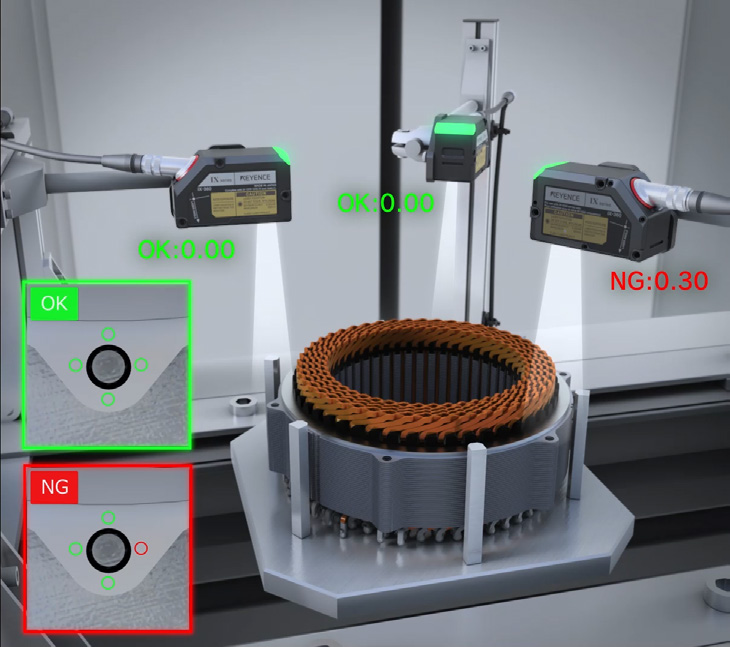 화상 탑재 레이저 변위 센서 IX 시리즈는 하나의 센서로 중심부와 가장자리 등 여러 지점의 높이를 동시에 측정하고, 그 차이를 연산하여 기울기를 판별할 수 있습니다. 따라서 부품 및 지그의 공차에 영향을 받지 않고 뒤집힘 불량만을 정확하게 검출하여, 조립 불량을 사전에 방지할 수 있습니다.