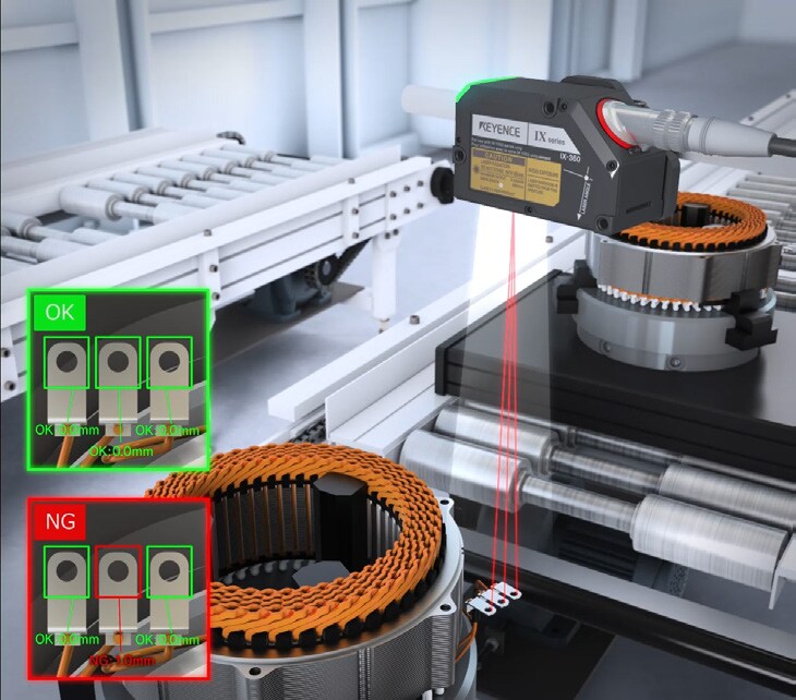 화상 탑재 레이저 변위 센서 IX 시리즈는 넓은 시야를 활용해 단 1대의 센서로 여러 개의 단자 높이를 동시에 검사할 수 있습니다. 따라서 여러 개의 센서를 설치할 필요가 없어 설비 공간과 비용을 획기적으로 절감하고, 단자의 휨 불량을 확실하게 방지하여 제품 품질을 높일 수 있습니다.
