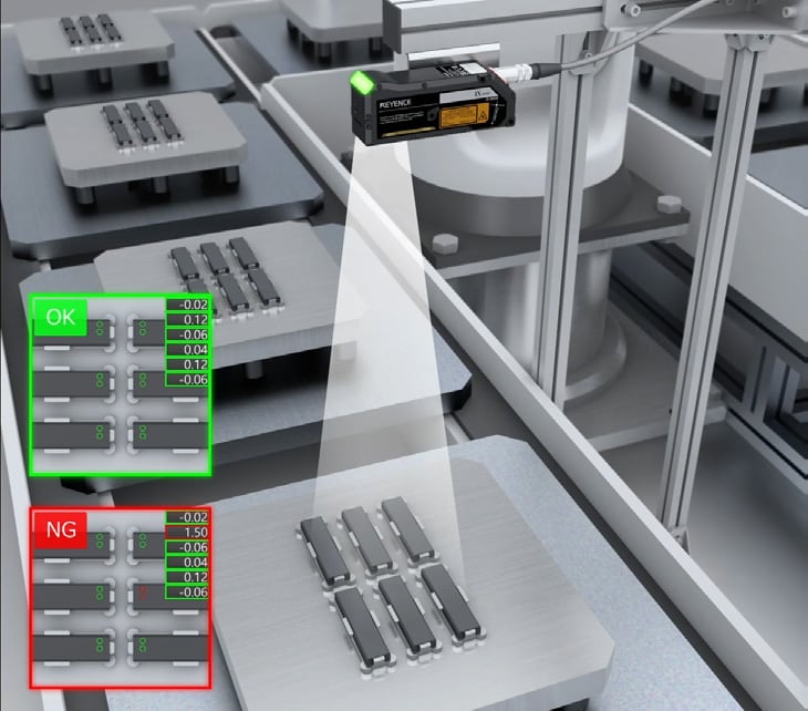 화상 탑재 레이저 변위 센서 IX 시리즈는 외관이 아닌 높이 차이로 앞뒷면을 판별합니다. 하나의 센서로 여러 지점의 높이를 동시에 측정하여 미세한 형상 차이를 감지하므로, 방향을 정확하게 판별할 수 있습니다. 이를 통해 조립 오류를 사전에 방지하고 설비 가동률을 안정적으로 확보할 수 있습니다.