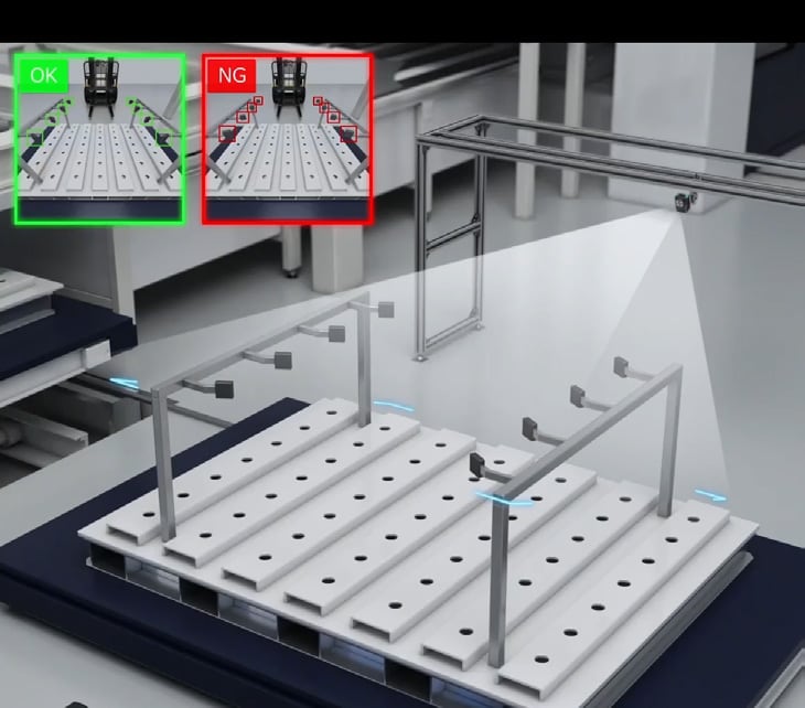 AI 탑재 스마트 비전 IV 시리즈를 사용하면 팔레트 방향을 사전에 감지하여, 반대로 세팅된 상태로 다음 공정에 진입하는 것을 방지할 수 있습니다. 과거 컬러 센서로 판별했을 때는 오염/개체 차이로 오검출 가능성이 있었지만, AI 탑재 스마트 비전 IV 시리즈를 사용하면 더욱 안정적으로 판정할 수 있습니다.