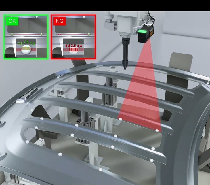 화상 탑재 레이저 변위 센서 IX 시리즈는 라인 모드를 통해 매스틱 도포 직후 최대 16곳의 높이를 동시에 측정할 수 있습니다. 이를 통해 도포량을 정량적으로 관리하여 제진 성능을 확보하고, 패널 결합 전 불량을 확실하게 검출하여 품질 안정성에 기여할 수 있습니다.