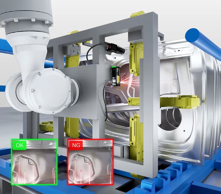 IX 시리즈와 비전 시스템을 조합하면, 부품의 높이(Z)는 물론 위치와 기울기(XYΘ) 편차까지 3차원으로 정확하게 측정할 수 있습니다. 이 좌표 보정값을 로봇에 전달하여 팔레트 내 부품을 정확하게 피킹할 수 있습니다.