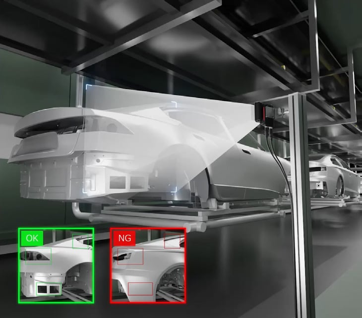 AI 탑재 스마트 비전 IV 시리즈는 넓은 시야의 '면'으로 차종을 판별하므로 행거가 흔들려도 안정적인 검사가 가능합니다. 또한, AI 학습 기능으로 주변 조명 변화에 관계없이 차종의 특징을 정확히 인식하며, 다양한 차종을 하나의 프로그램으로 손쉽게 등록할 수 있어 차종 전환 시에도 재설정할 필요가 없습니다.