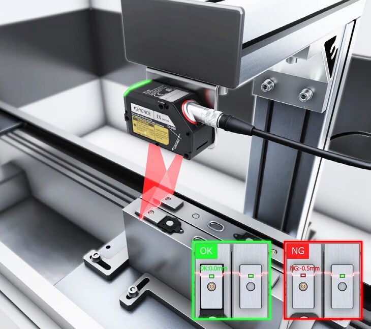 기존 레이저 변위 센서는 한 지점(포인트)의 높이만 측정할 수 있었습니다. 반면, 화상 탑재 레이저 변위 센서 IX 시리즈는 라인(선) 형태로 넓은 영역을 측정하여, 그 안의 여러 지점의 높이를 동시에 확인할 수 있습니다.