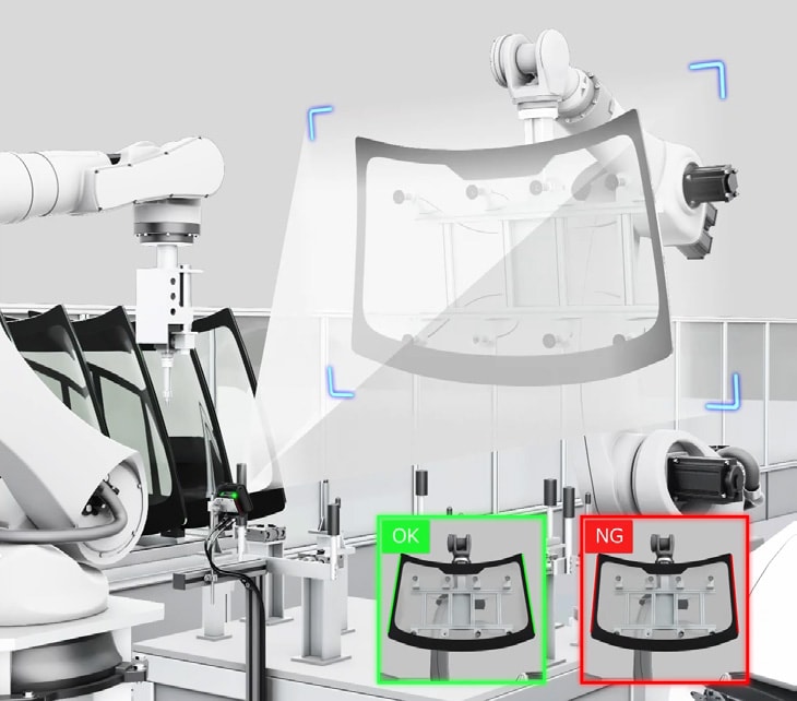 AI 탑재 스마트 비전 IV 시리즈는 넓은 시야(광시야)를 한 번에 검사할 수 있고, 학습 기능을 통해 육안으로 구분하기 힘든 미세한 형상 차이까지 정확하게 판별합니다. 이 솔루션은 프론트 글라스, 리어 글라스, 도어 글라스, 델타 윈도우 등 차량의 모든 유리에 적용할 수 있습니다.