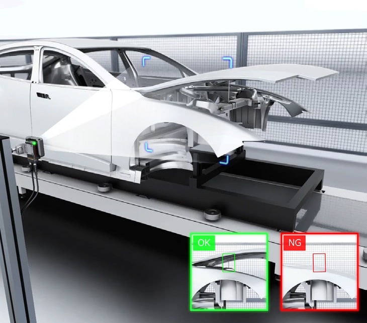 하지만 기존의 카메라는 검사 거리가 멀어 밝기가 부족해 안정적으로 검사하기 어려웠습니다. AI 탑재 스마트 비전 IV 시리즈는 강력한 조명이 내장된 장거리 모델을 통해 스토퍼 누락을 확실하게 검출할 수 있습니다.
