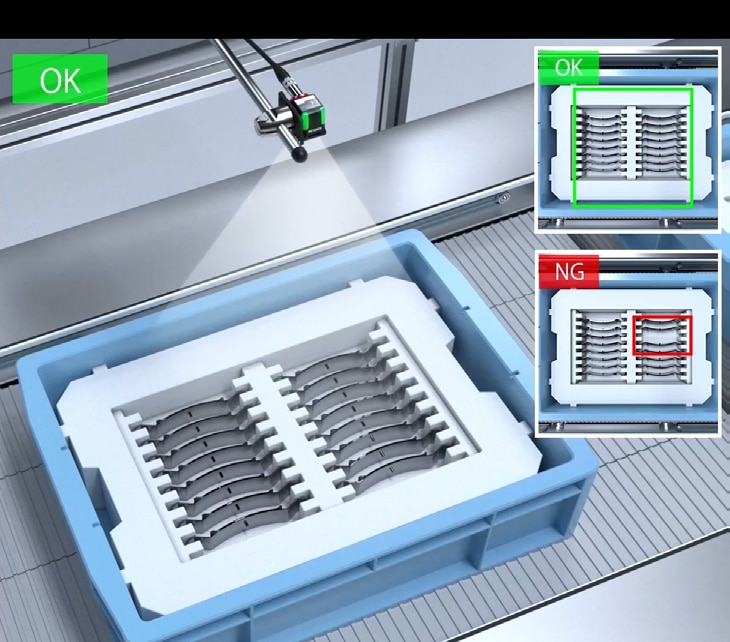AI 탑재 스마트 비전 IV 시리즈는 단 하나의 센서로 부품의 수량 확인과 박스의 방향 판별을 동시에 수행할 수 있습니다. 이를 통해 검사 공정을 간소화하고, 작업 오류로 인한 라인 정지를 사전에 방지할 수 있습니다.