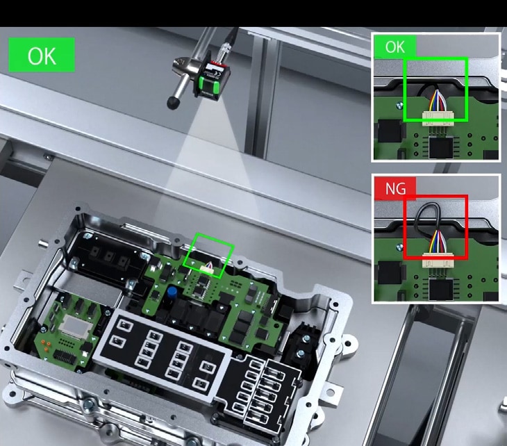 AI 탑재 스마트 비전 IV 시리즈는 여러 종류의 정상(OK) 배선 패턴과 비정상(NG) 배선 패턴이 존재하는 경우에도, 학습 기능을 사용하여 모든 패턴을 손쉽게 등록할 수 있습니다. 복잡한 설정 없이 다양한 패턴을 등록하는 것만으로, 배선 경로의 정합성을 안정적으로 판별할 수 있습니다.