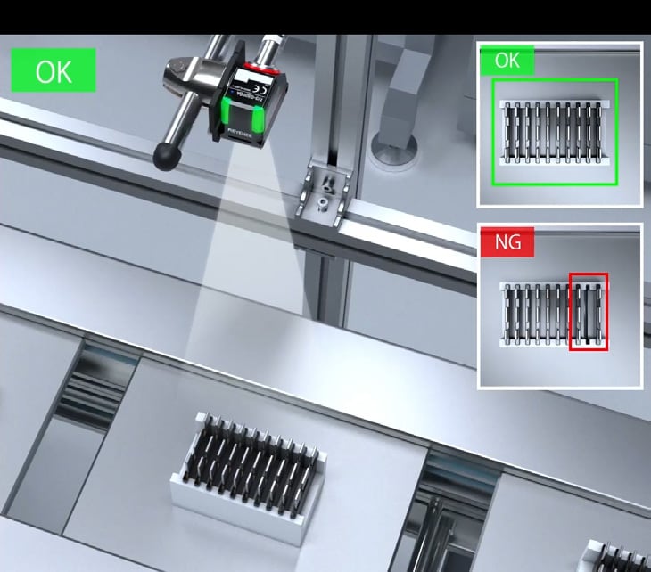 AI 탑재 스마트 비전 IV 시리즈의 학습 기능을 사용하면, 파워 모듈이 모두 채워진 정상 상태(OK)를 단 한 번 등록하는 것만으로 설정이 완료됩니다. 이후 검사 시, 학습된 패턴과 다른 빈 공간이 발견되면 즉시 NG 판정을 내리고 그 위치 정보까지 출력할 수 있습니다.