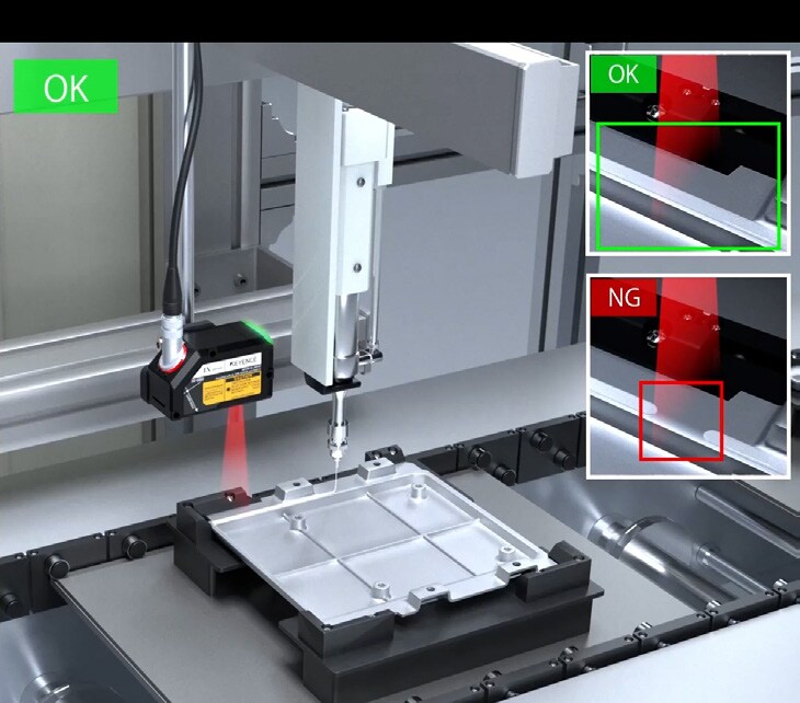 화상 탑재 레이저 변위 센서 IX 시리즈를 사용하면, 접착제가 도포된 면적을 기준으로 판별할 수 있으므로, 단순한 유무 검출을 넘어 더욱 안정적인 검출이 가능합니다.