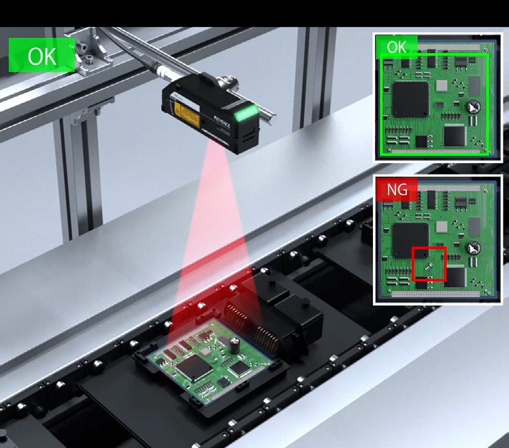 화상 탑재 레이저 변위 센서 IX 시리즈를 사용하면, 높이를 기준으로 검출하므로 나사와 같은 큰 이물질은 간단한 설정만으로 쉽게 확인할 수 있습니다. 또한, 콘덴서와 같이 원래부터 높이가 있는 부품들은 미리 '마스크 설정'을 통해 검사 대상에서 제외할 수 있습니다.