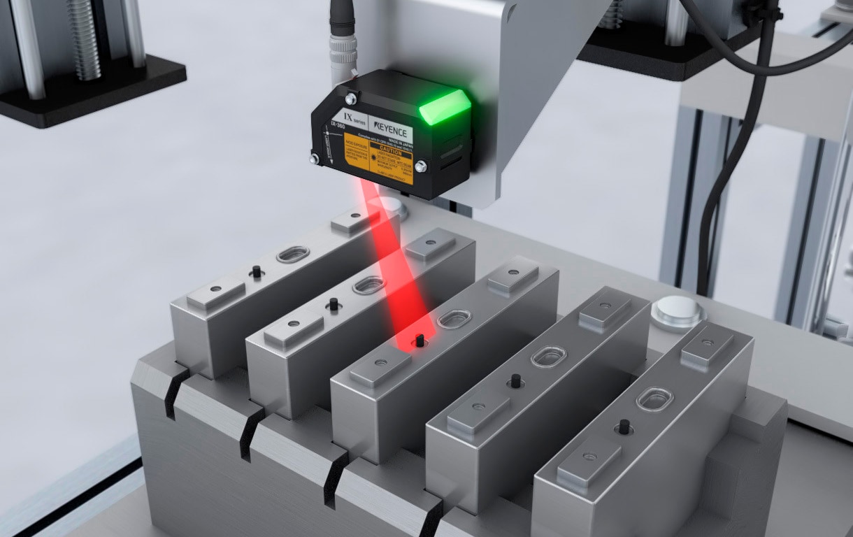 화상 탑재 레이저 변위 센서 IX 시리즈는 비접촉이므로 택 타임을 단축할 수 있습니다. 또한 셀의 위치가 어긋나도 위치 보정 기능이 탑재되어 있으므로 안정적으로 검출할 수 있습니다.