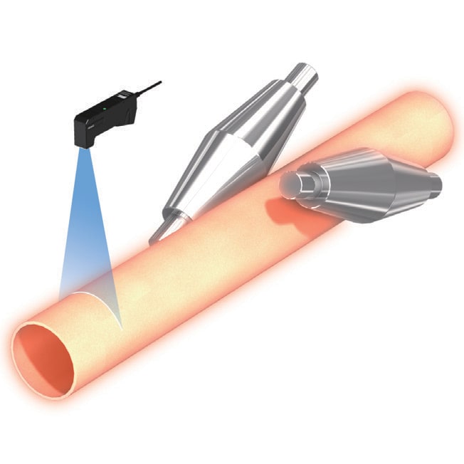 인라인 프로파일 측정기 LJ-X 시리즈는 수냉 재킷을 활용하여 초고온 환경에서도 안정적인 측정을 실현합니다. 원통형 대상 물체에 맞춰 비스듬한 설치가 가능하며, 2대의 센서 헤드로 양방향에서 동시에 측정하여 정확한 외경 관리를 할 수 있습니다.