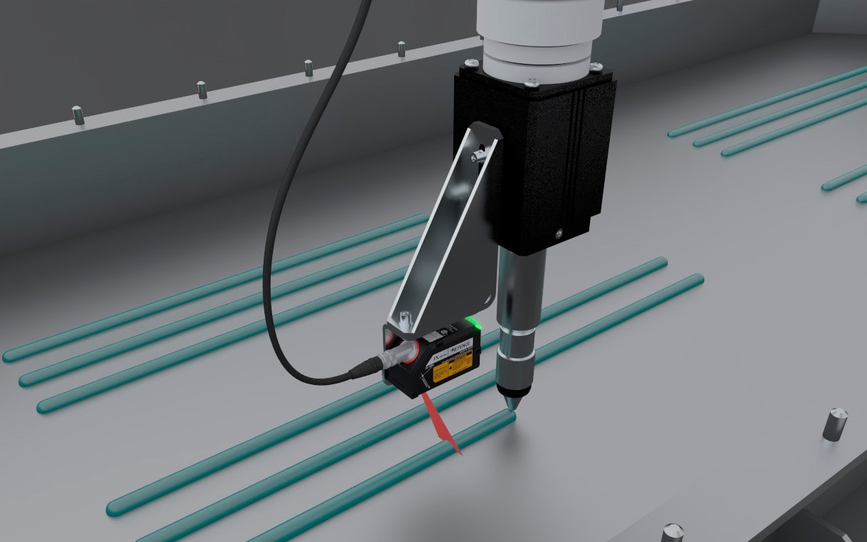 화상 탑재 레이저 변위 센서 IX 시리즈를 사용하면, 접착제의 끊김을 인라인에서 실시간으로 검출할 수 있으므로, 검사를 위해 대상 물체를 정지시킬 필요가 없습니다.