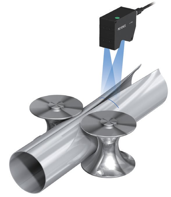 블루 레이저의 2차원 변위 센서로 전봉관 용접 시 재료의 단차 및 폭을 측정합니다. 용접 불량의 원인인 재료의 어긋남을 사전에 체크할 수 있습니다.