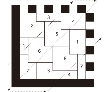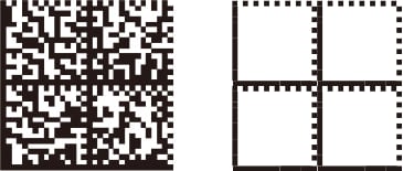 코드에 26 x 26 이상의 셀이 있는 경우(데이터의 24 x 24셀 이상), 아래의 그림과 같이, 측면 당 24셀을 초과하지 않는 블록으로 나뉩니다. 이러한 구조는 코드의 왜곡을 방지합니다.