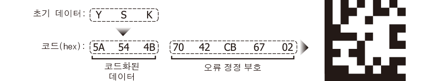 "YSK"를 Data Matrix 코드로 변환 시: YSK가 코드화되고 오류 정정 부호는 아래와 같이 산출되어 정사각형으로 배열됩니다.