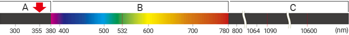 UV 레이저광의 파장은 기본 파장 레이저(1,064 nm)의 1/3(355 nm)입니다. 이 파장이 자외선 영역이기 때문에 「UV 레이저 마킹기」라고 합니다.