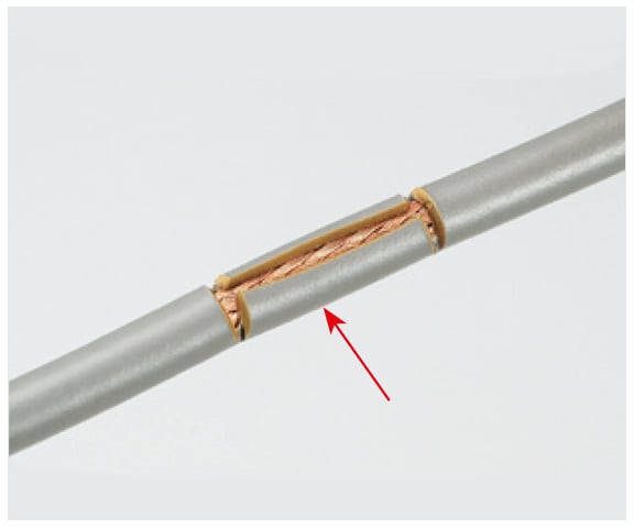 동축 케이블을 가공하는 경우에는 금속에 흡수되지 않는 CO2 레이저로 피막 부분을 절단하고, 금속의 미세 가공이 뛰어난 YVO4 레이저로 내부 도체·외부 도체를 절단할 수 있는 등 각 레이저광의 특성을 활용하여 동시에 가공할 수 있습니다.