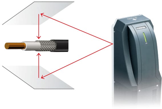 또한 경면 마감된 SUS 재질 등을 사용하여 레이저광을 반사시키면 전선의 앞과 뒤를 동시에 절단하는 가공이 가능합니다. 앞과 뒤의 가공을 한 번의 공정으로 완료할 수 있어 택 타임이 대폭 단축되고 생산 효율 향상으로 이어집니다.