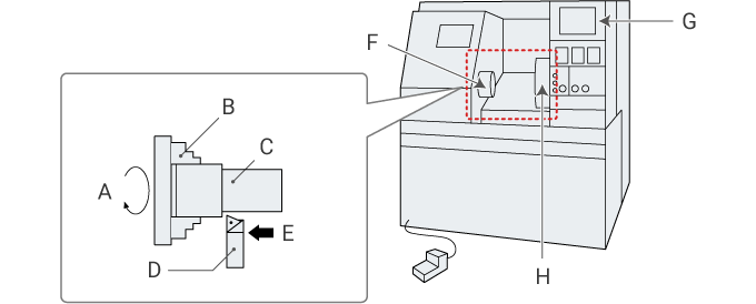 이와 관련하여 NC 선반에서 주류가 된 것은 터릿이라는 회전 장치에 여러 개의 바이트를 장착하고 터릿을 회전시킴으로써 다른 바이트로도 가공할 수 있게 만든 타입입니다. 이로 인해 가공물을 척(장착 장치)에 고정한 상태에서 하나의 공정이 완료된 후 다른 공정을 연속해서 실시할 수 있습니다.