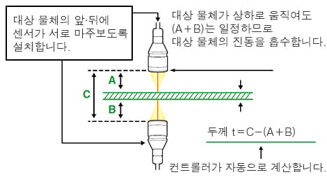 불투명한 대상 물체는 반사형 레이저 변위 센서를 이용해 위아래에서 측정.