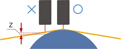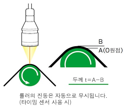 롤러를 기준으로 그 위의 대상 물체 두께를 측정할 경우, 롤러와 대상 물체 사이에 틈새가 생기면 측정 오차가 발생합니다. 다음 사항에 주의하며 틈새가 생기지 않도록 설비를 구축해 주십시오.